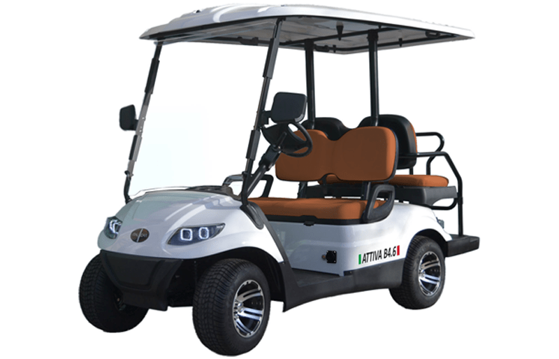 Véhicule électrique 4 places, version basse performance de l’ATTIVA 4.6. Ce véhicule est utilisé pour le transport et le déplacement de personnes à l’intérieur d’installations touristiques, industrielles et sportiv